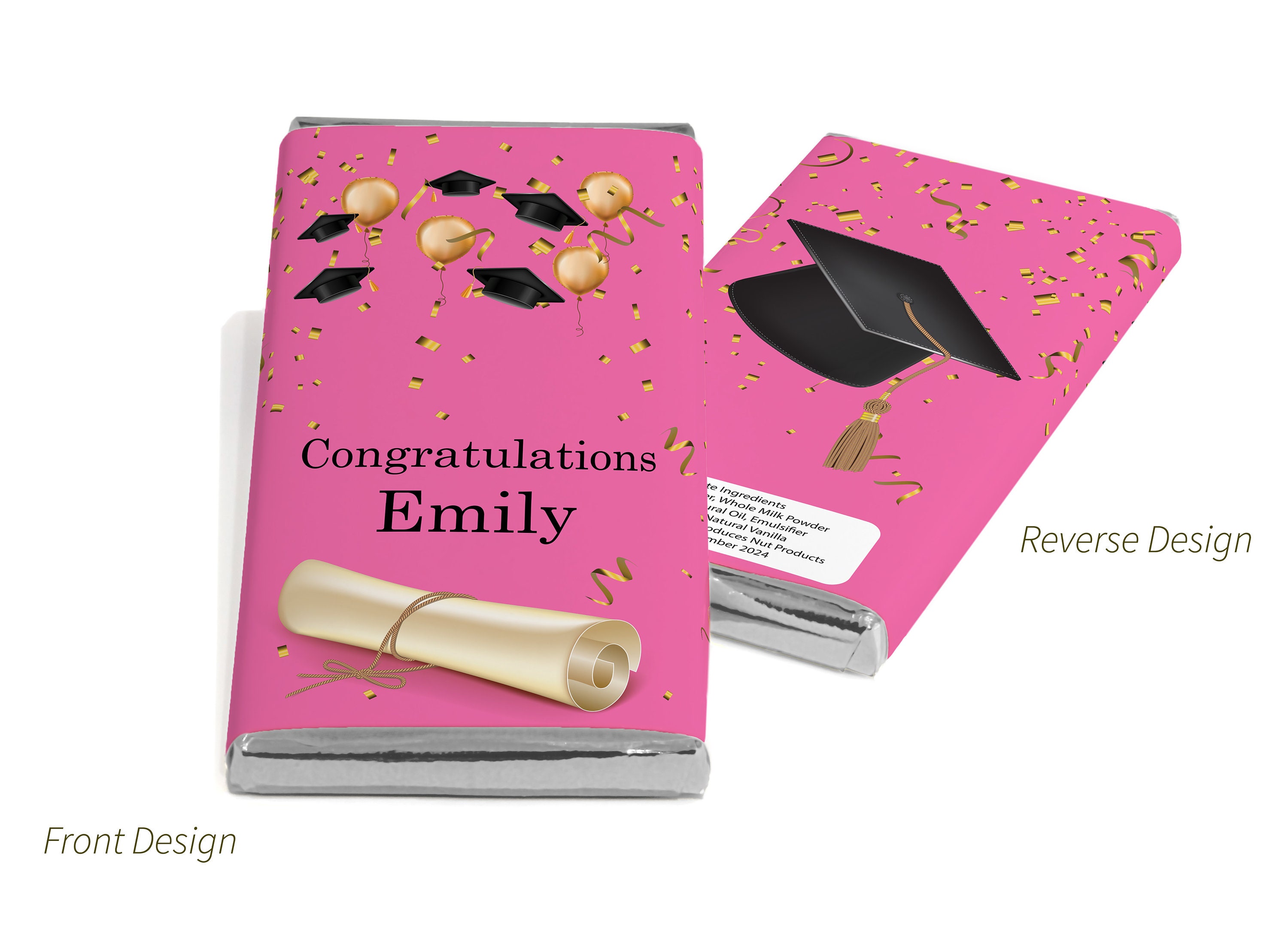 Graduation Chocolate Bars - Personalised Favours - 80g Milk Chocolate Bars in Gold & Silver Foils - Pink V1