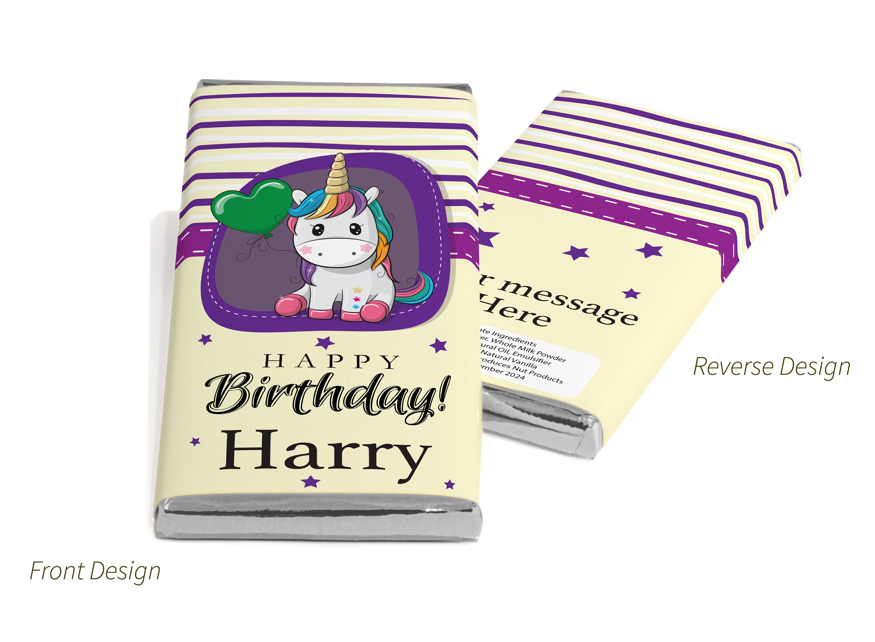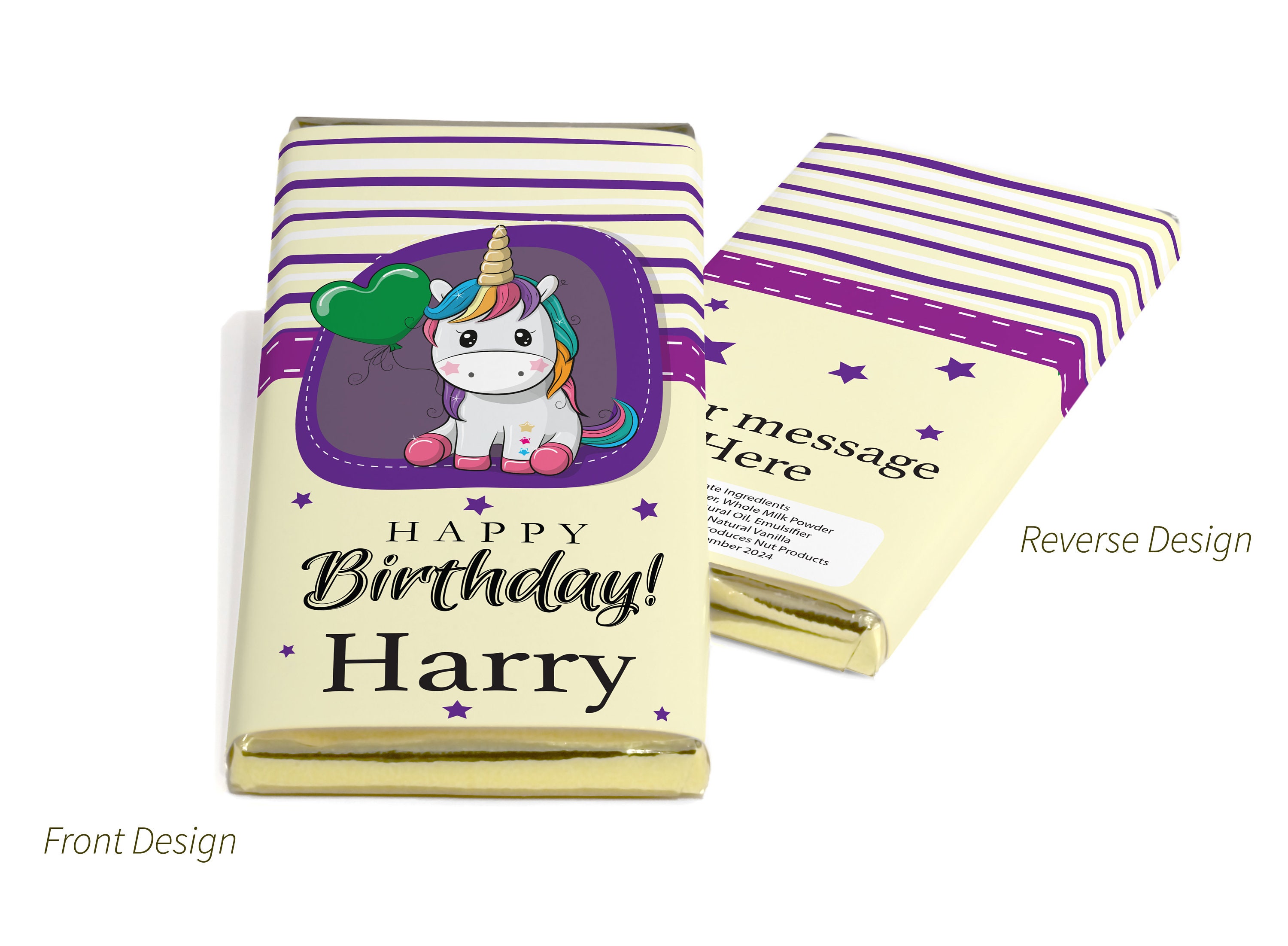 Birthday Unicorn Chocolate Bars - Personalised Favours - 80g Milk Chocolate Bars in Gold & Silver Foils - V0