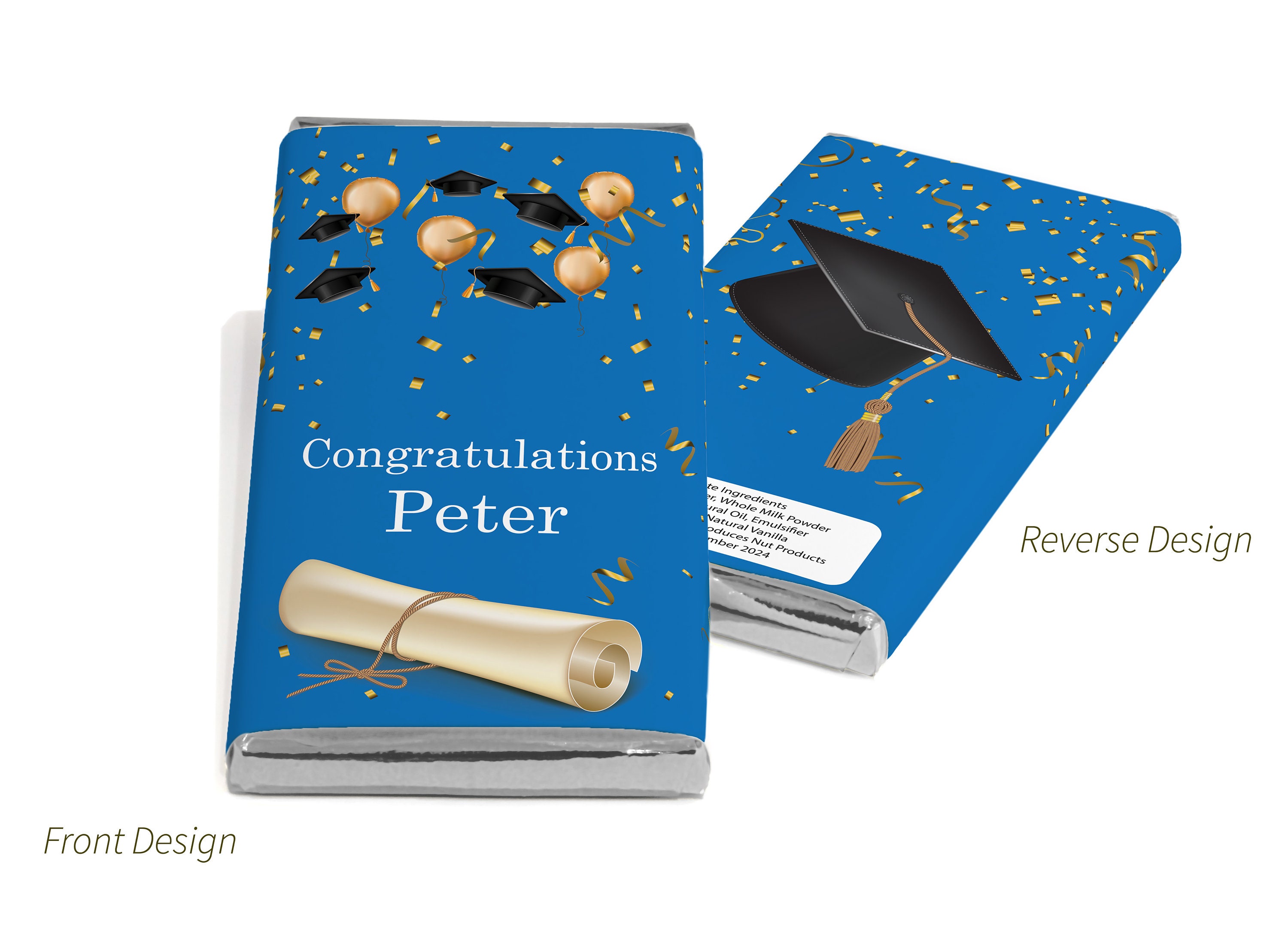 Graduation Chocolate Bars - Personalised Favours - 80g Milk Chocolate Bars in Gold & Silver Foils - Blue V1