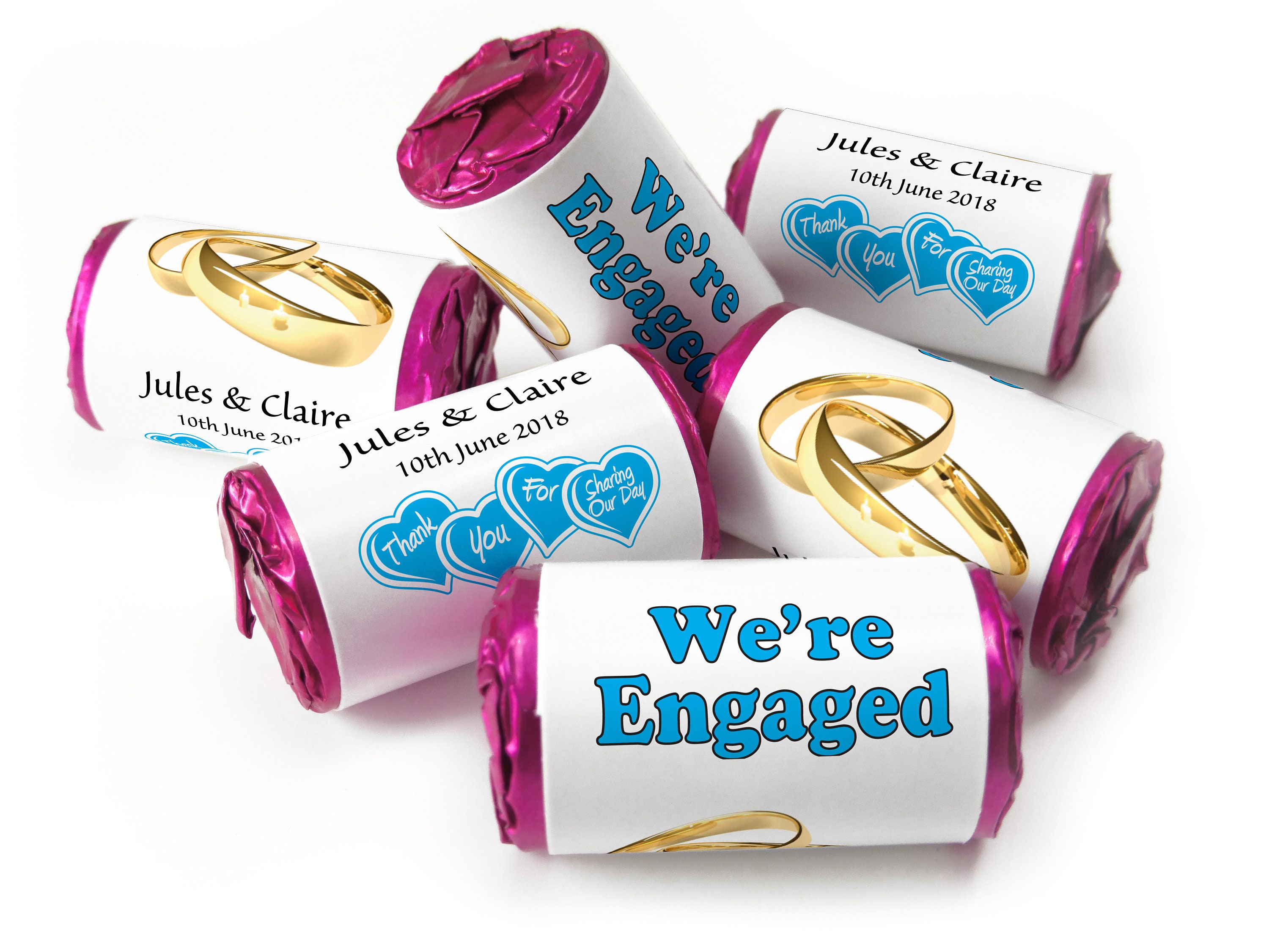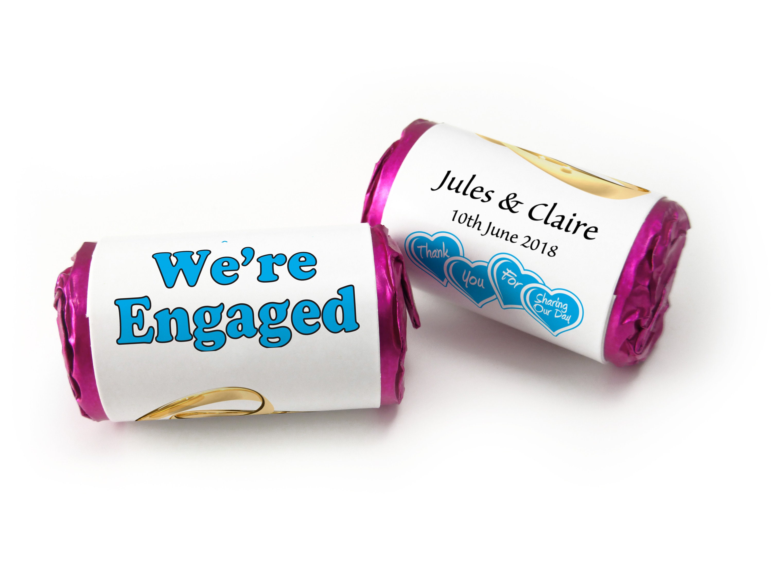 Engaged Sweets - Personalised Engagement Favours - Love Heart Sweets with Inner Foil choices- Gold Rings / Blue Text - V0