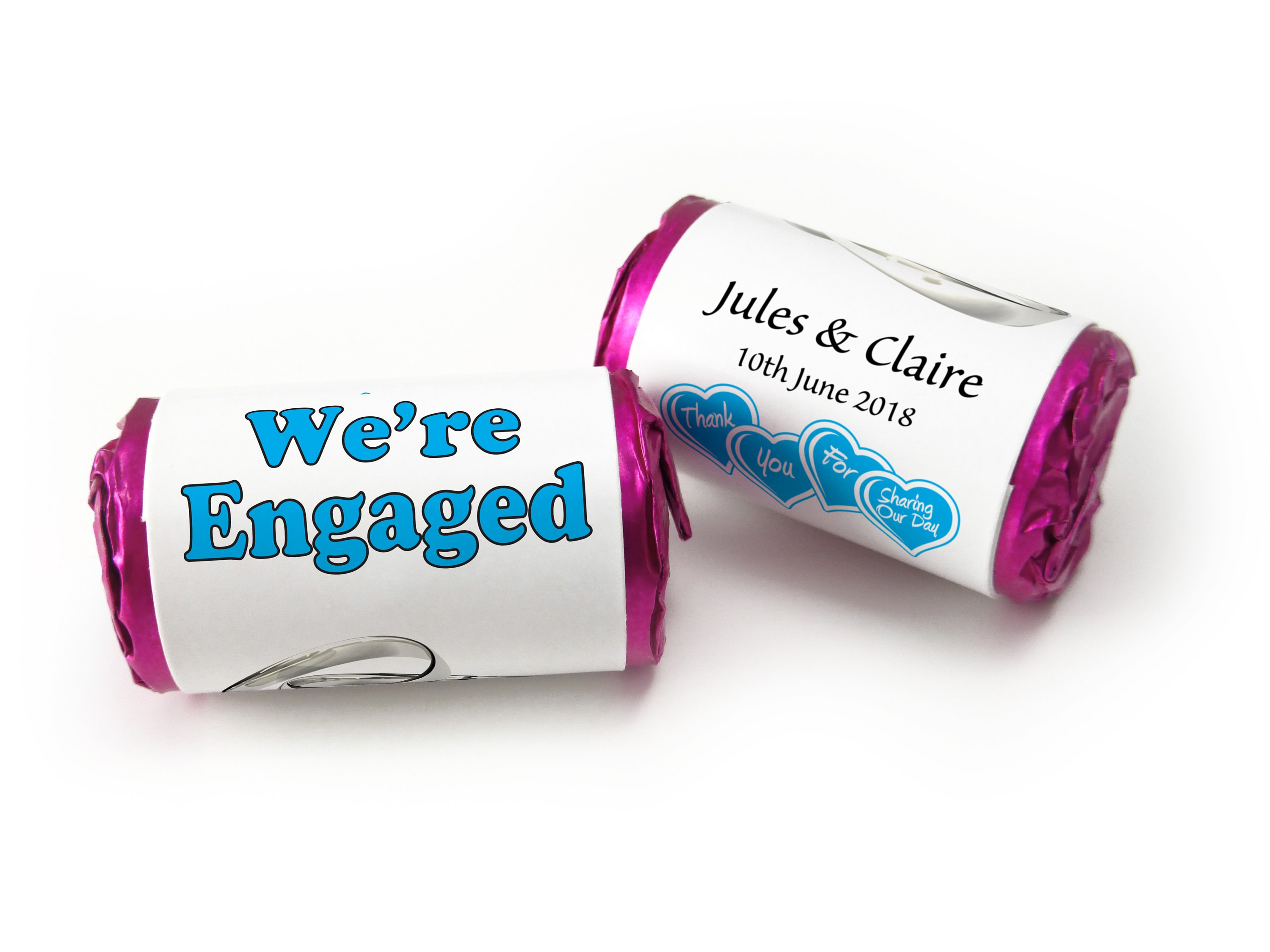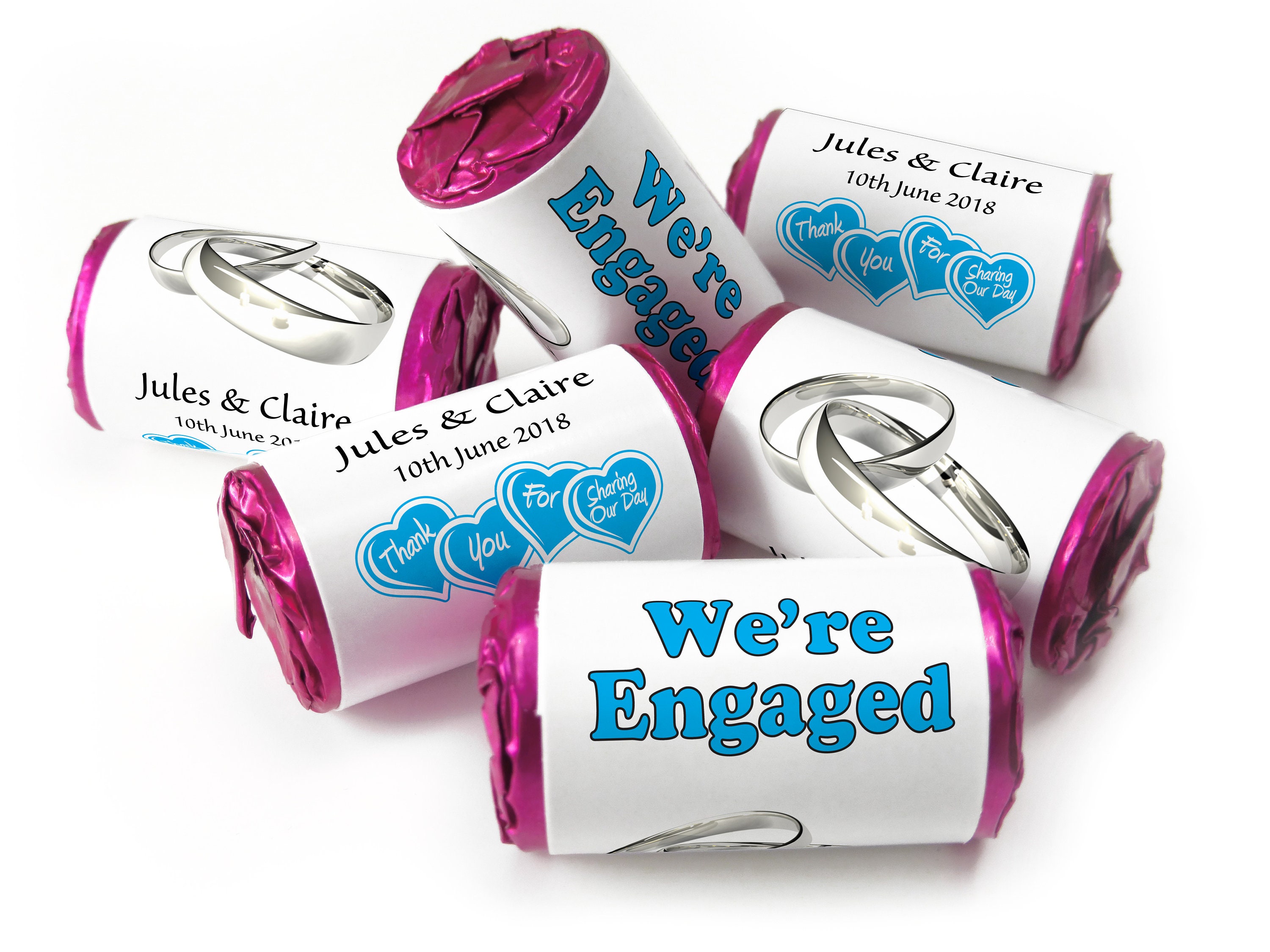 Engaged Sweets - Personalised Engagement Favours - Love Heart Sweets with Inner Foil choices - Silver Rings / Blue Text - V0