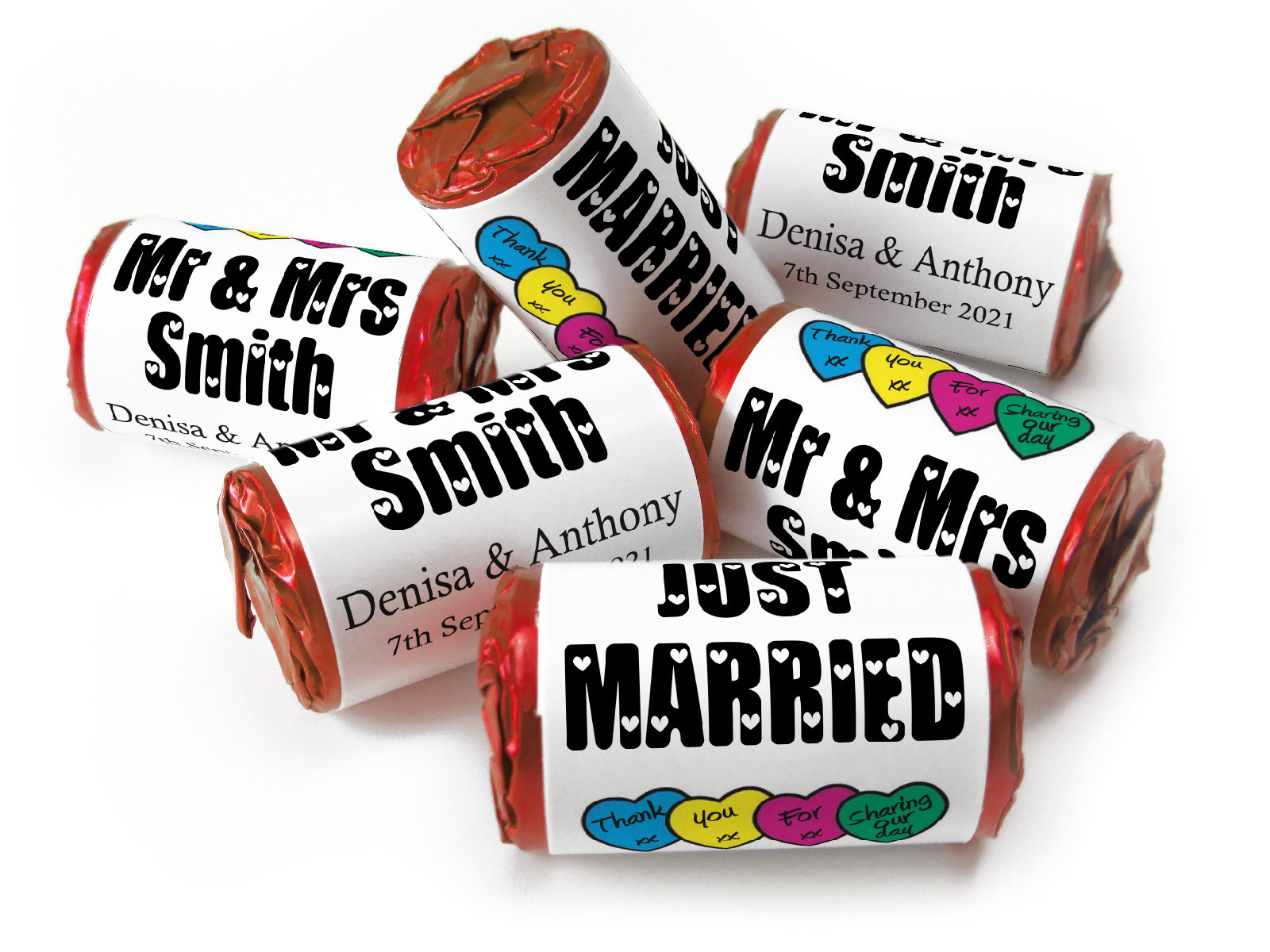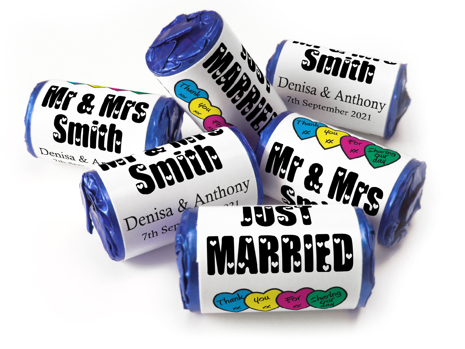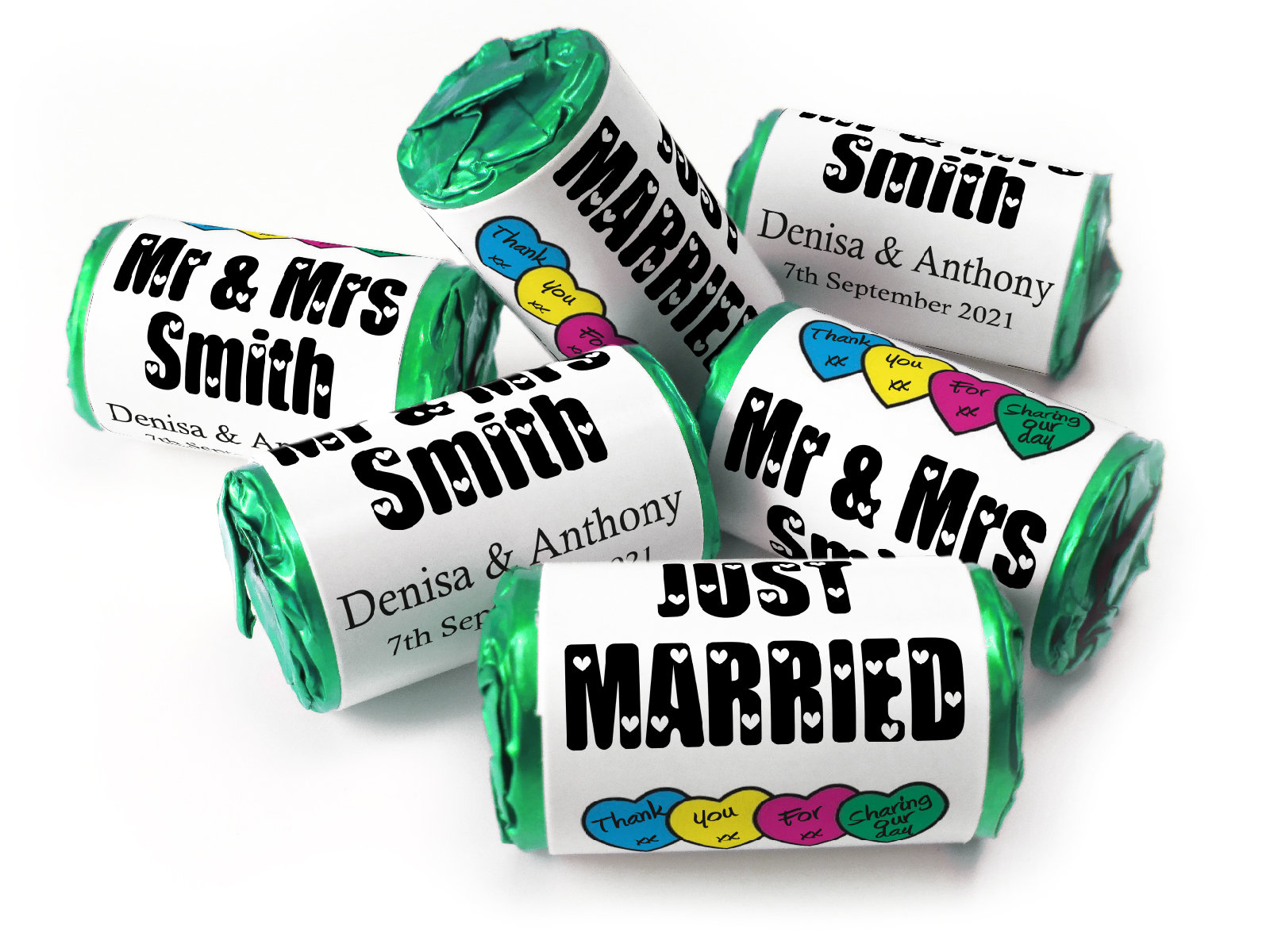 We’re proud to offer foil-wrapped Love Heart sweets, 11 different colours as an exclusive option after Swizzels moved to plastic ends. Our foil finish offers a more elegant, durable presentation – ideal for high-end events. (Please note: foil options may incur a slightly higher cost due to longer production time.)