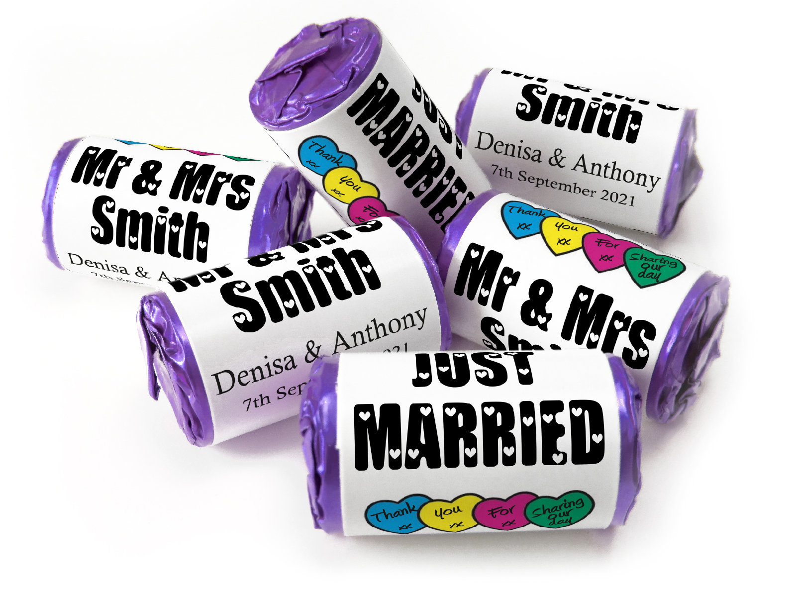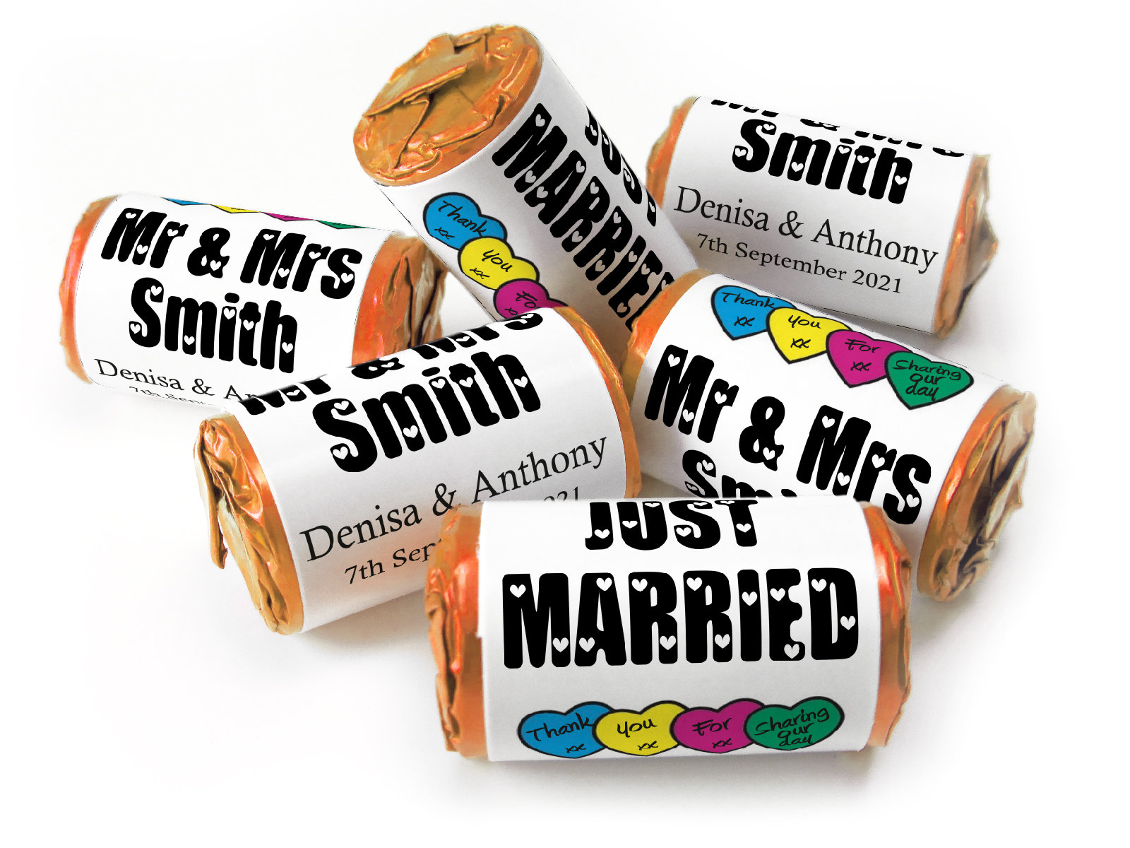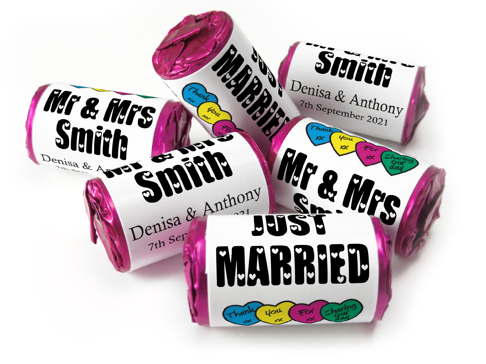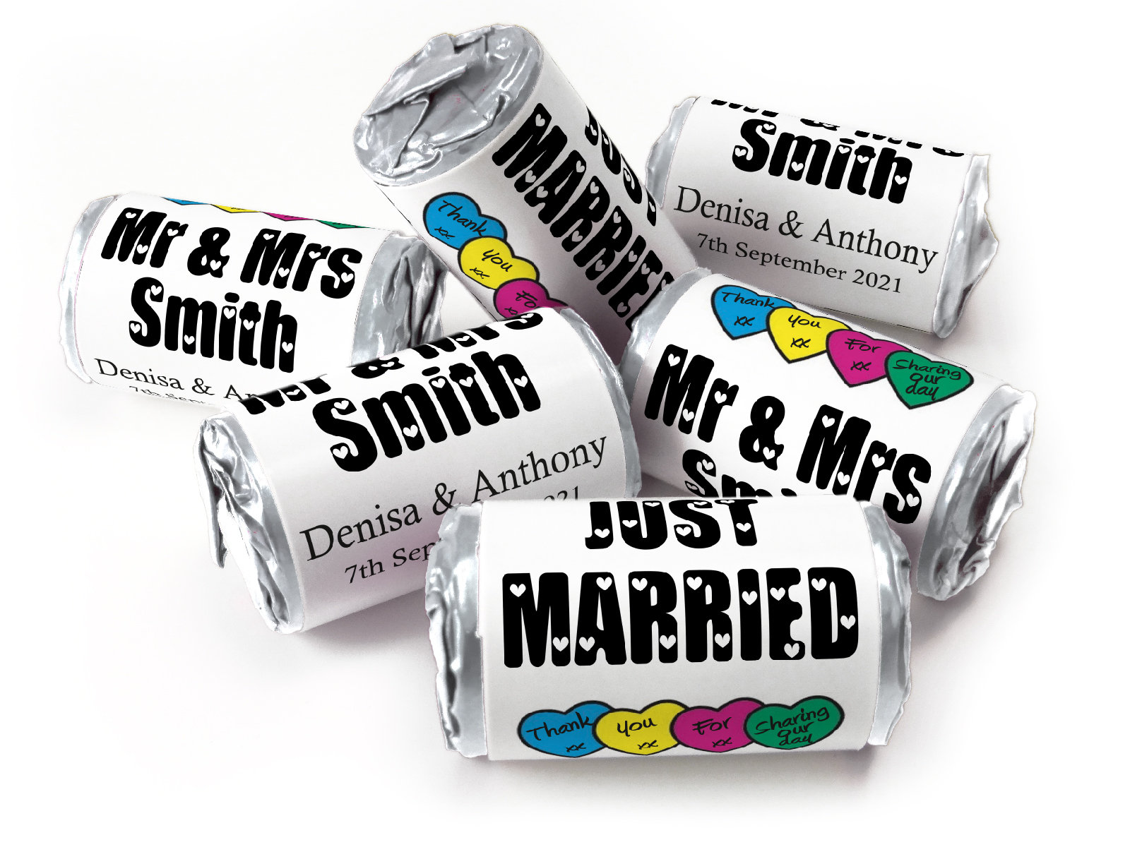 We’re proud to offer foil-wrapped Love Heart sweets, 11 different colours as an exclusive option after Swizzels moved to plastic ends. Our foil finish offers a more elegant, durable presentation – ideal for high-end events. (Please note: foil options may incur a slightly higher cost due to longer production time.)