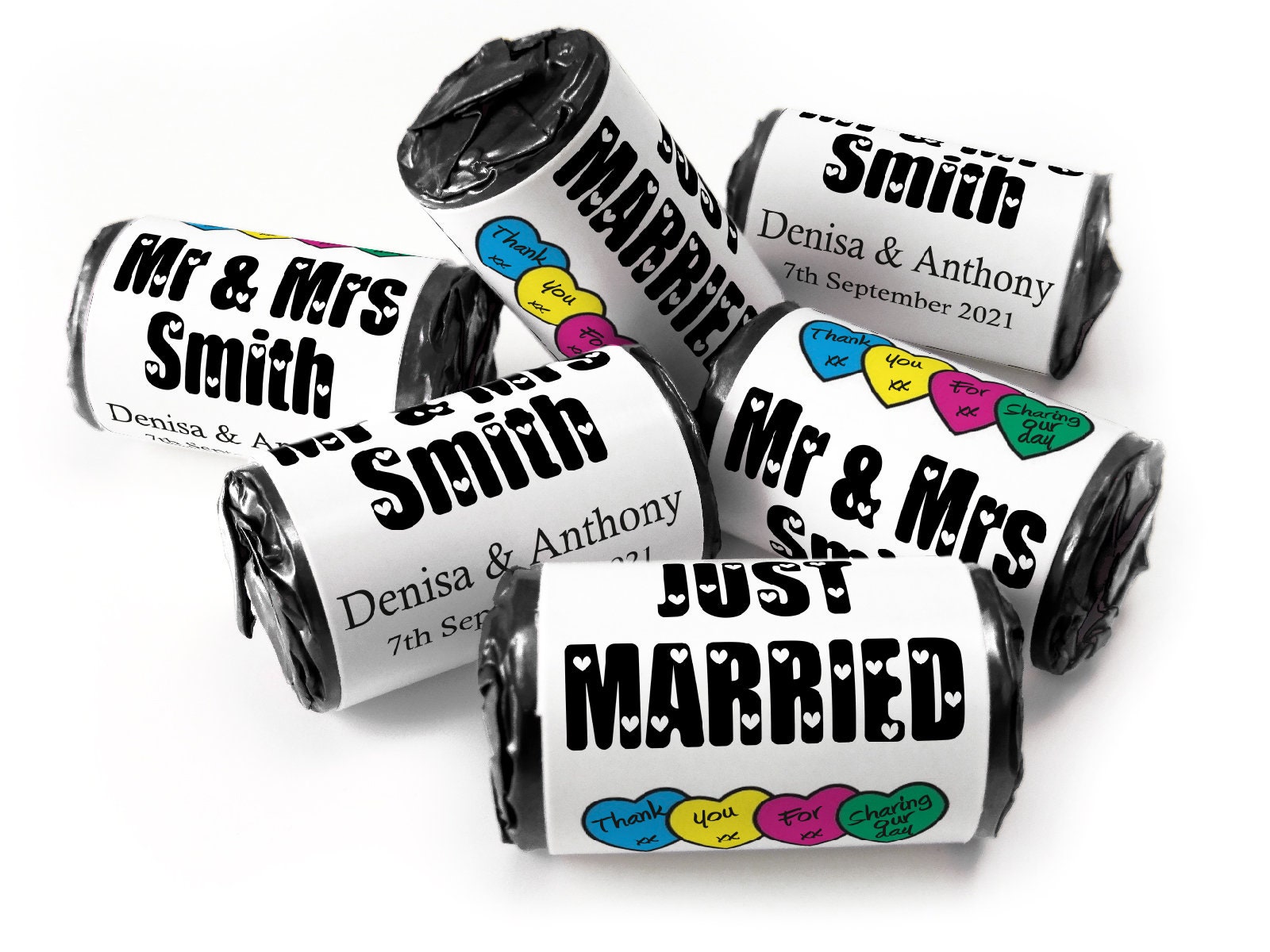 Wedding Sweets - Personalised Wedding Favours - Love Heart Sweets with Inner Foil choices - Black Text - V7