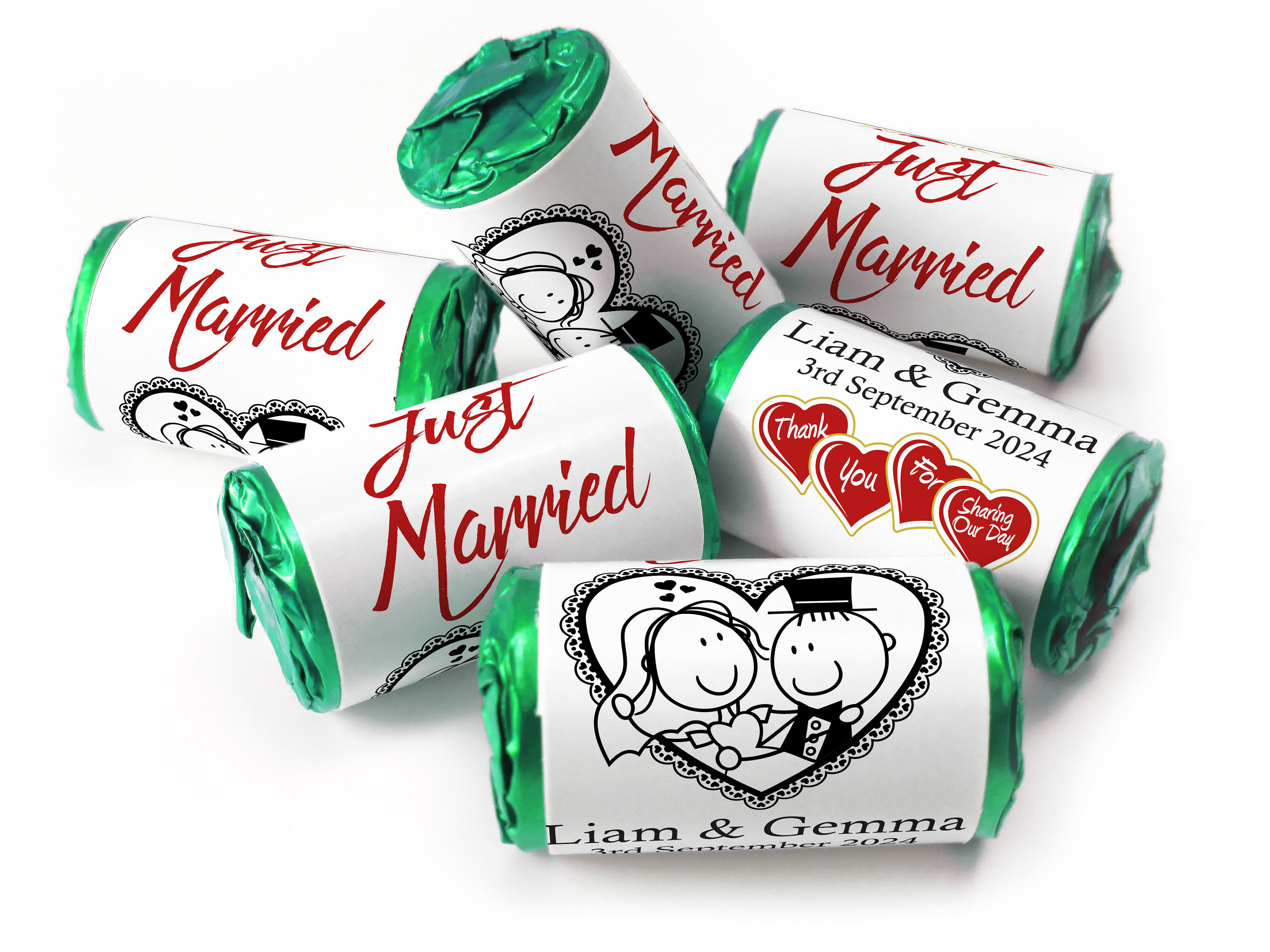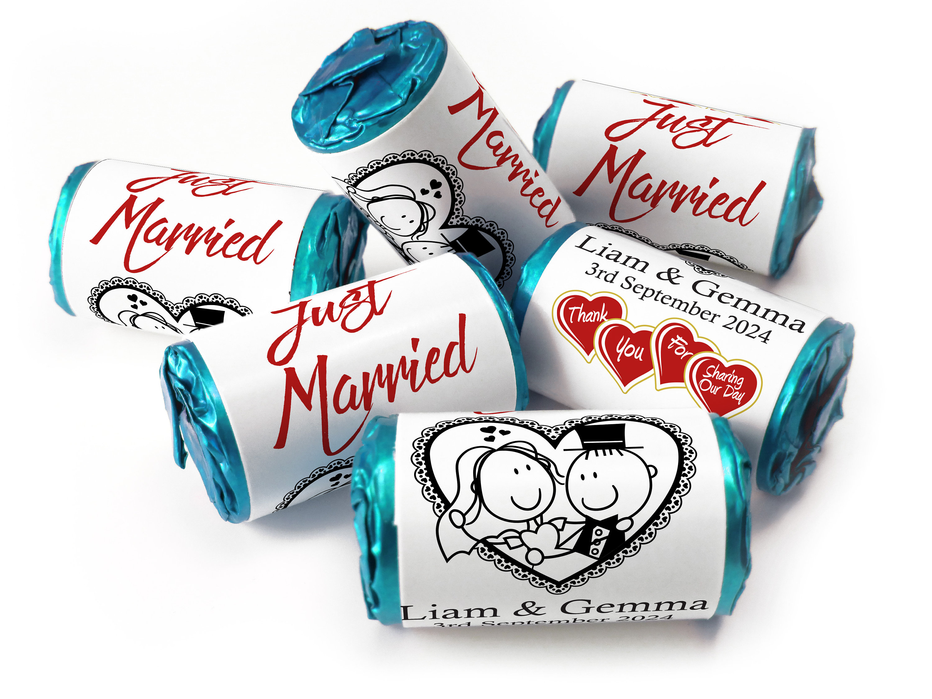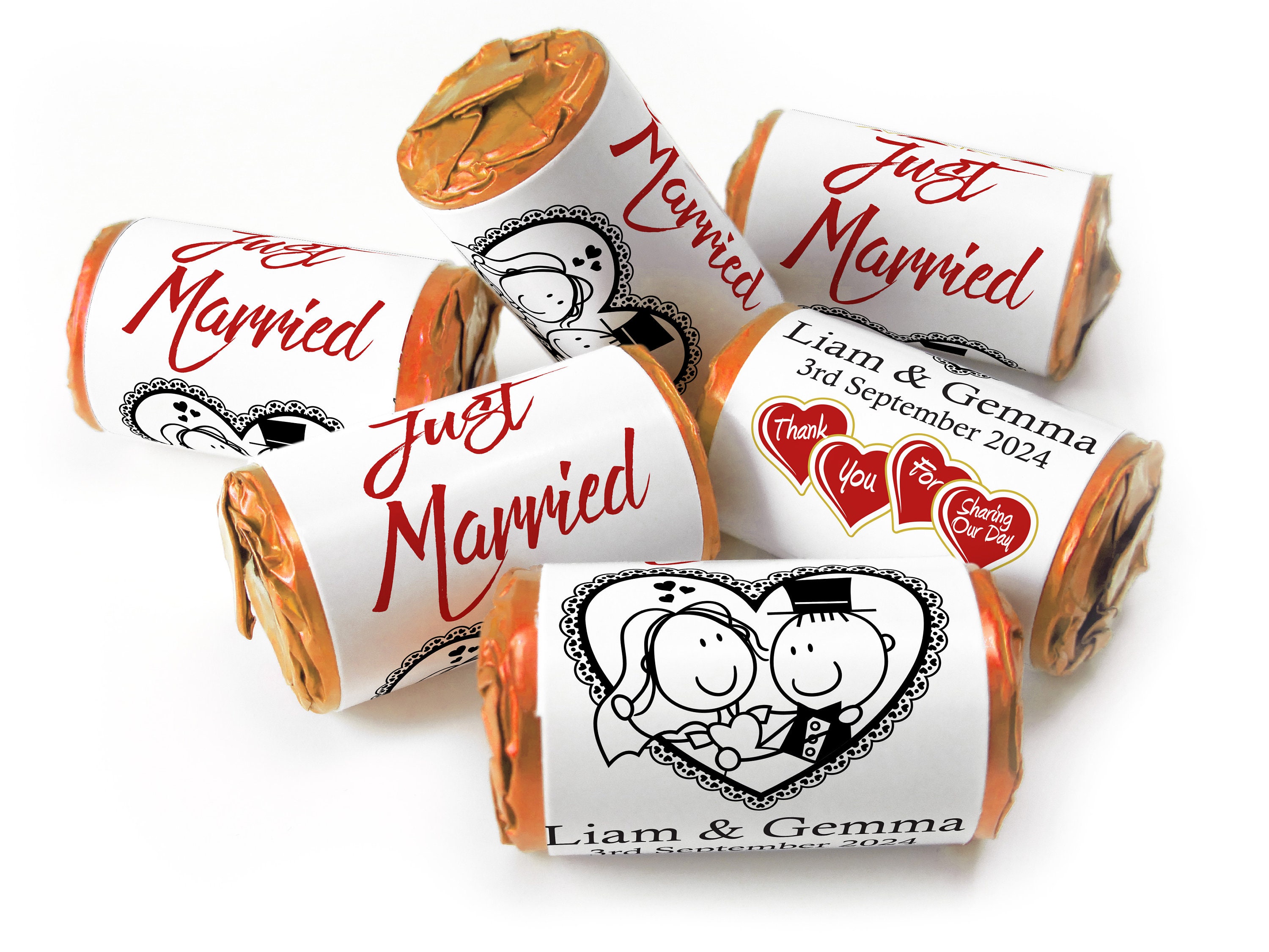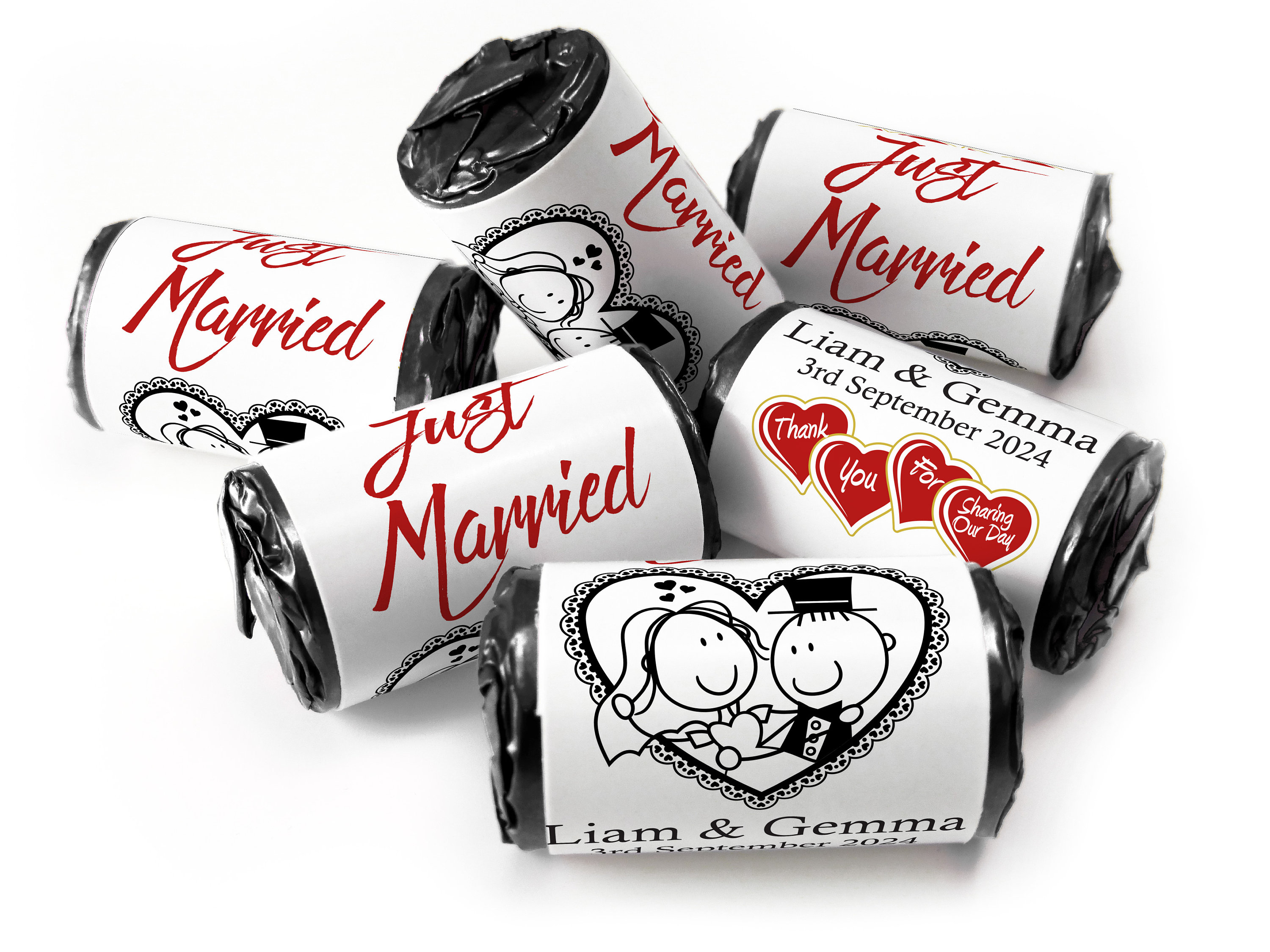 Wedding Sweets - Personalised Wedding Favours - Love Heart Sweets with Inner Foil choices - Cartoon, V14