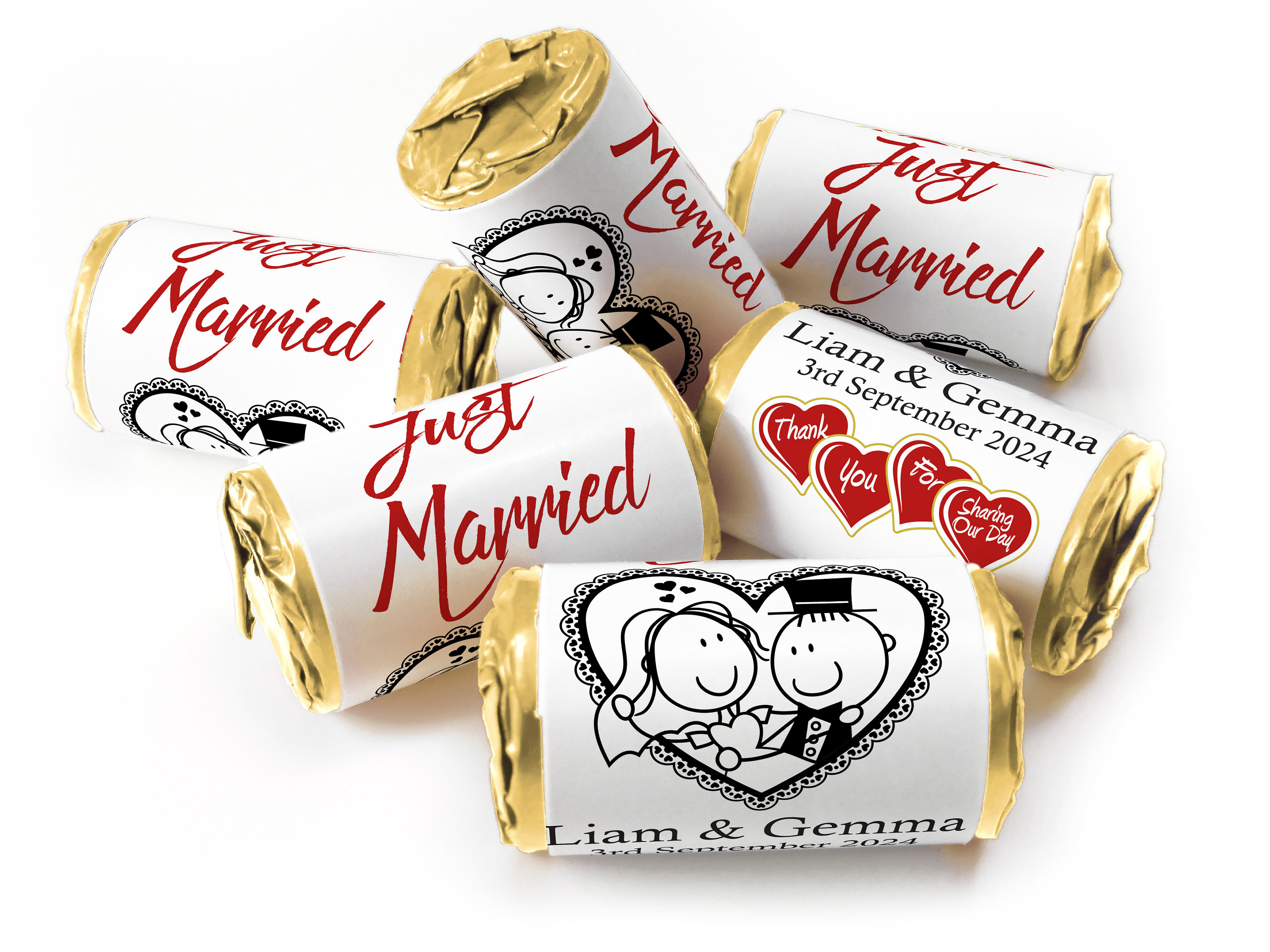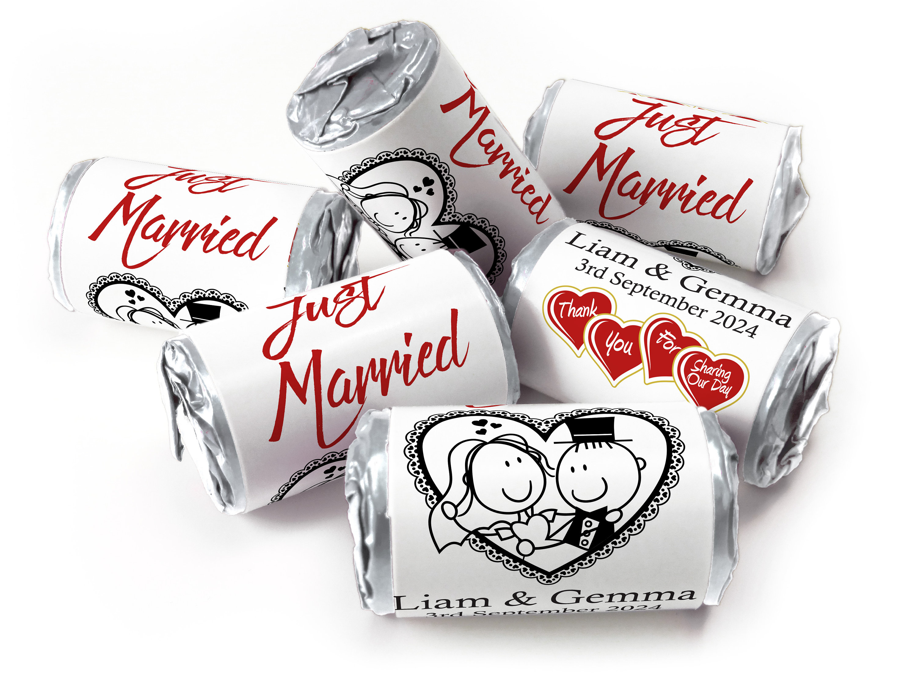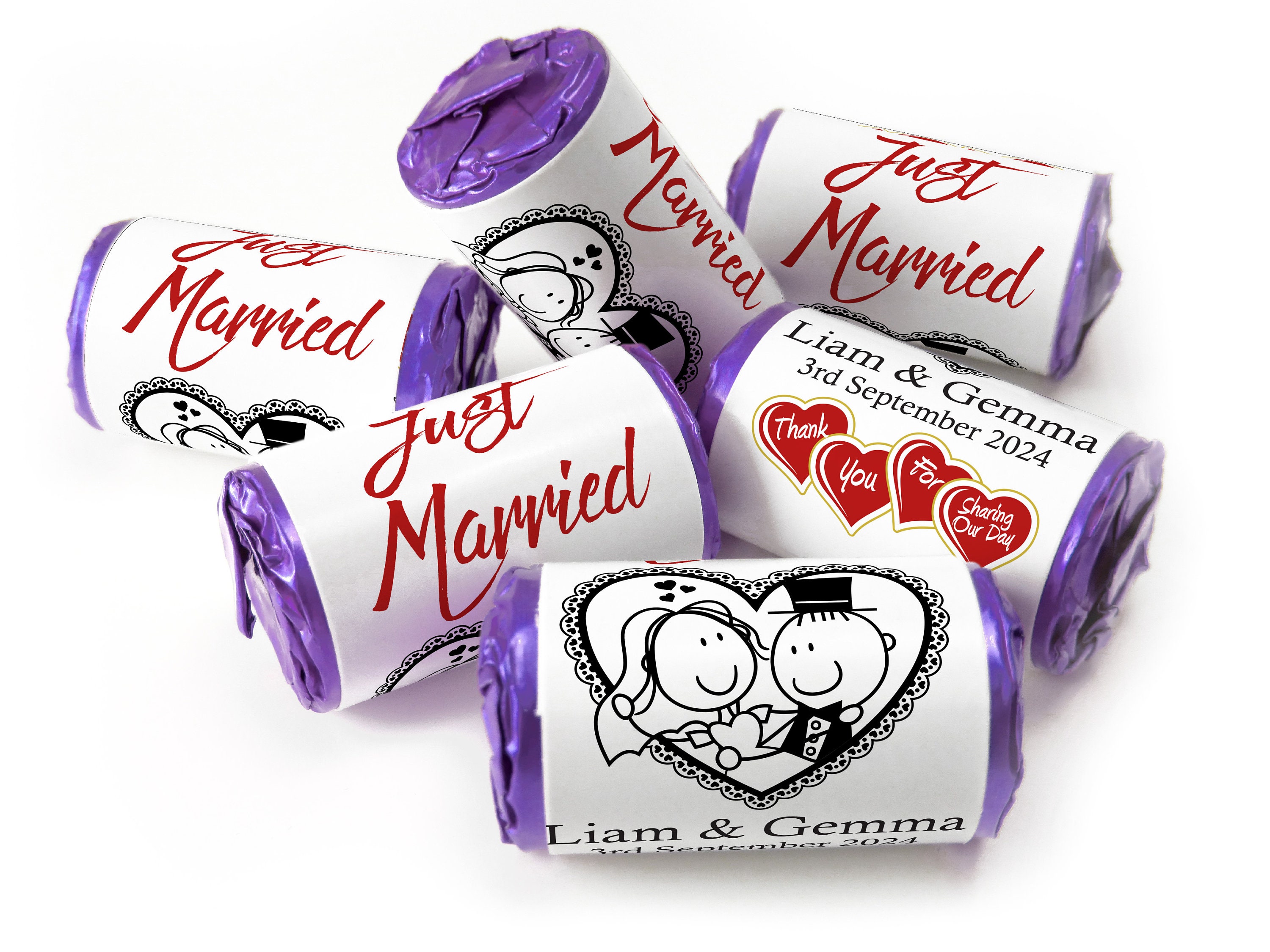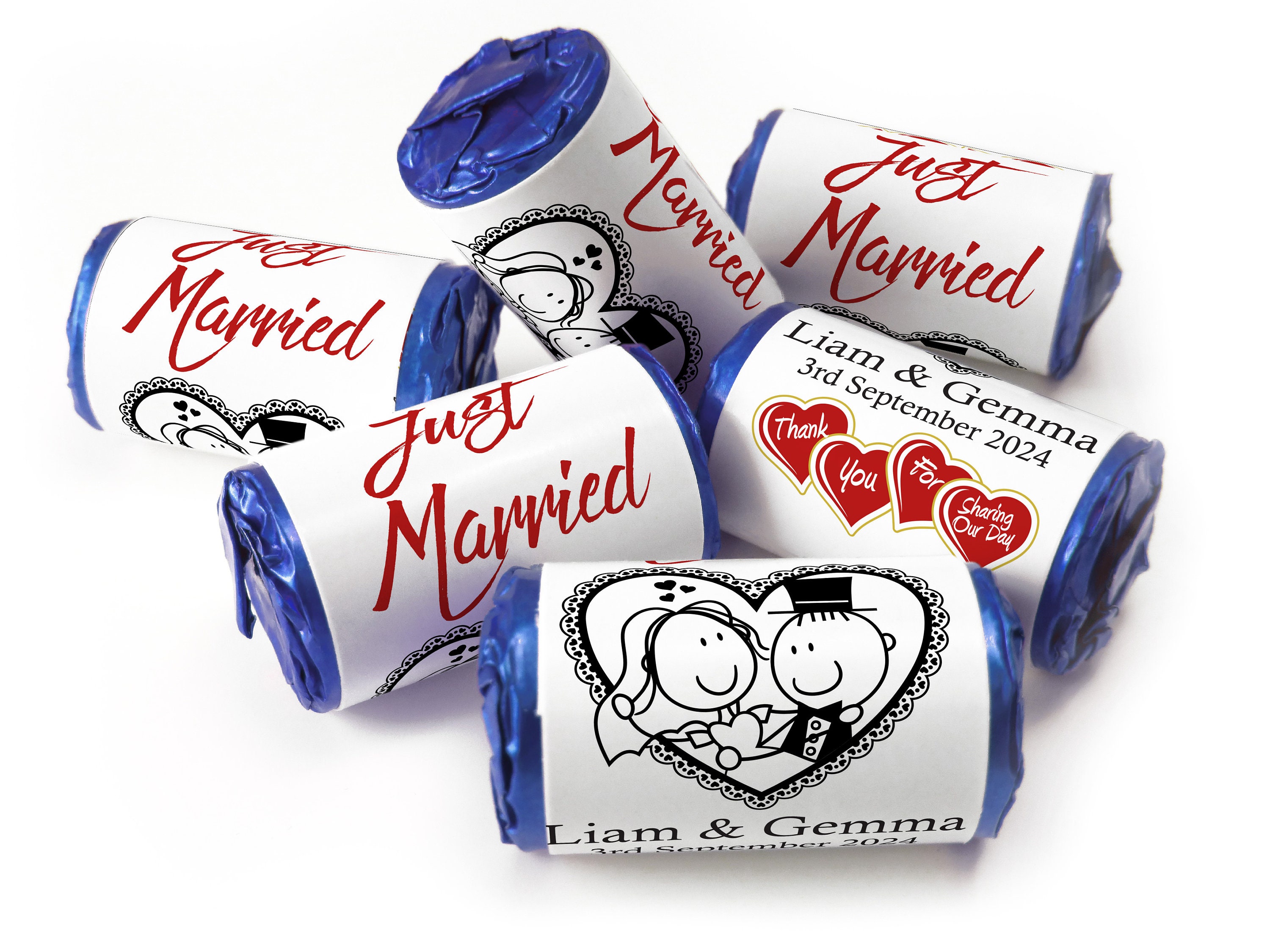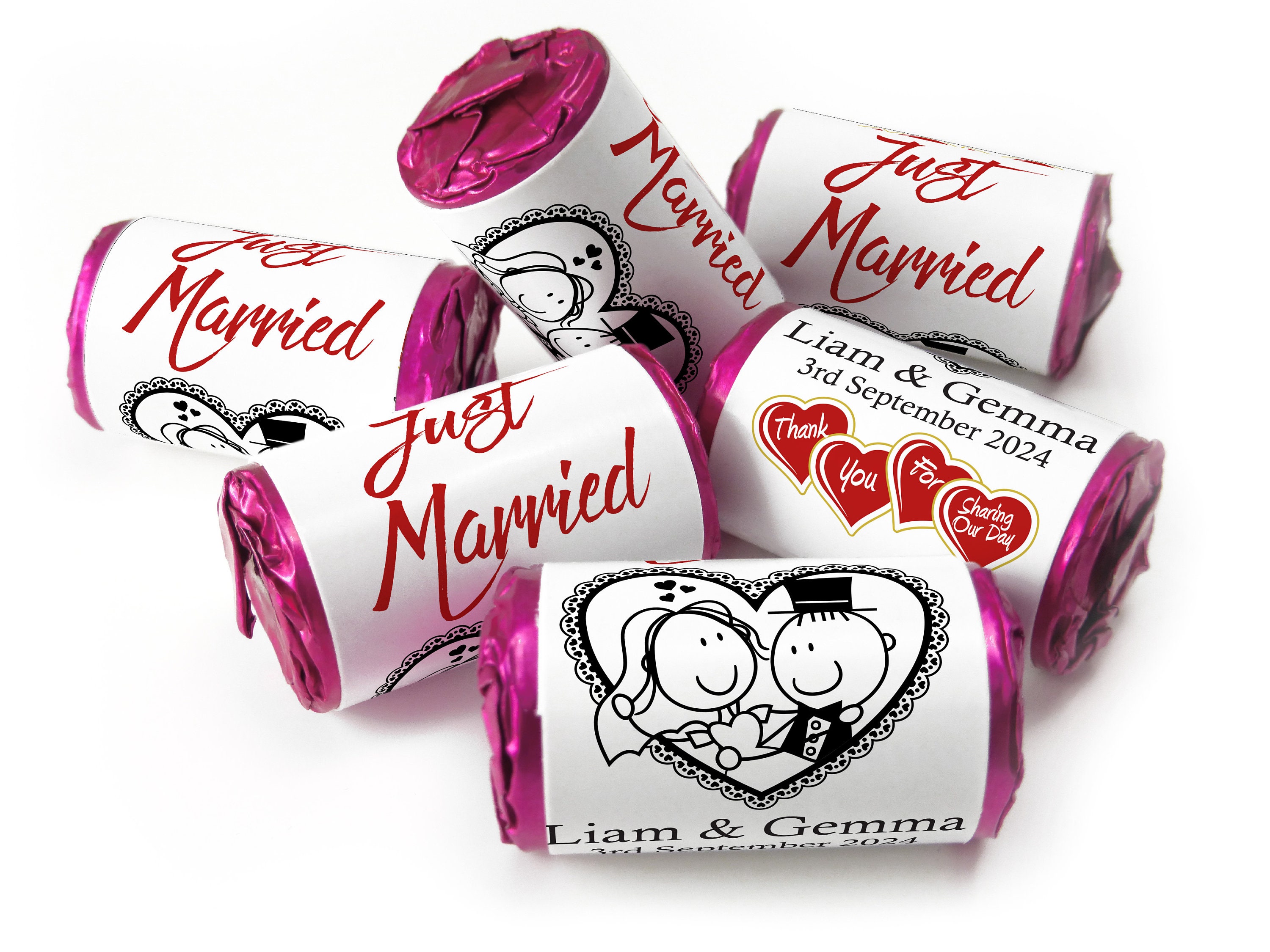 Wedding Sweets - Personalised Wedding Favours - Love Heart Sweets with Inner Foil choices - Cartoon, V14